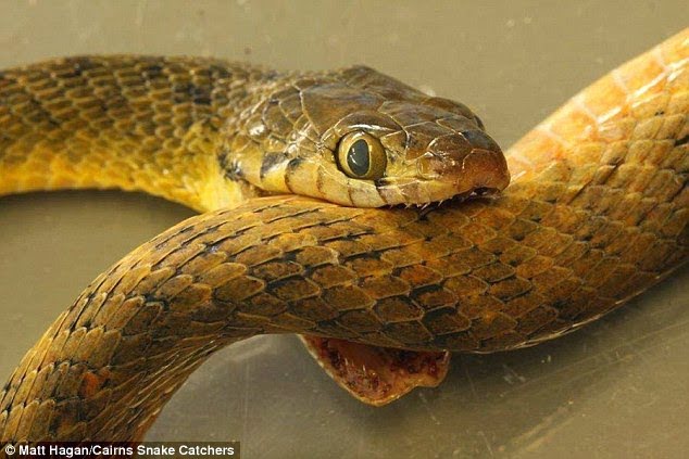 मैट हैगन जब वहां पहुंचे तो उन्होंने देखा की वो सांप अभी भी वही बैठा हुआ है। लेकिन जब वो उस सांप के पास पहुंचे तो उन्होंने देखा की सांप ने अपनी गर्दन को अपने मुंह में दबा रखा है और उसकी मौत हो चुकी है। उन्होंने जब उसकी मौत का कारण जानने के लिए उसका परिक्षण किया तो उन्होंने पाया की उसकी मौत खुद के ज़हर के खुद के शरीर में इंजेक्ट होने के कारण हुई है। इसका मतलब उस सांप ने स्वयं अपने शरीर को काट कर सुसाइड किया है।